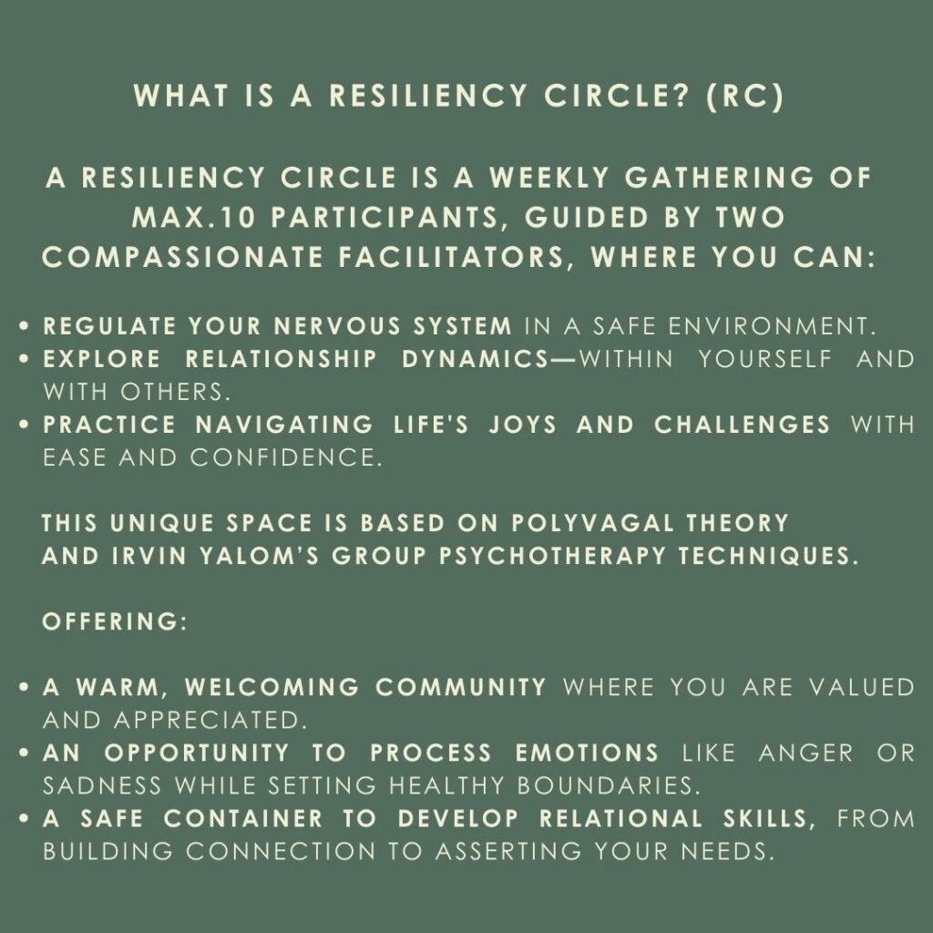 A Resiliency Circle is a powerful place of discovery, an invitation to step into the here and now with your full self, in a container of safety.